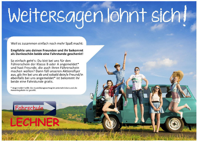 Neues Jahr, neue Aktion. ;) Ab sofort kannst du Freunde werben und dir so gratis Fahrstunden sichern! Hier steht wie es funktioniert: